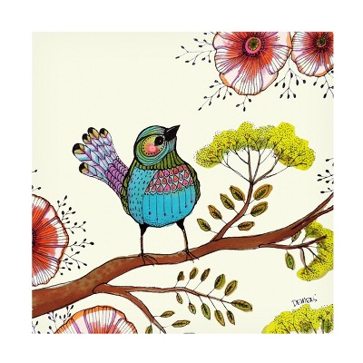 This ready to hang, gallery-wrapped art piece features a blue bird amongst flowers and mushrooms on a blue background.Sylvie has always been mesmerized by color. Her world is light and full of happy surprises. Living in the Greater Montreal area of Canada, she has illustrated multiple book covers for the Presses de l'Universite du Quebec. In 2011 she joined the COLOURlovers.com community and ever since has been designing pattern templates that are youthful and fresh. In 2012 she won the Gelaskins.com "Become Our New Artist" contest. Watercolor and acrylic paints help her to express her optimism and inner spontaneity. She enjoys learning new techniques and exploring her creativity.Giclee (jee-clay) is an advanced printmaking process for creating high quality fine art reproductions. The attainable excellence that Giclee printmaking affords makes the reproduction virtually indistinguishable from the original piece. The result is wide acceptance of Giclee by galleries, museums, and private collectors. Gallery wrap is a method of stretching an artist's canvas so that the canvas wraps around the sides and is secured a hidden, wooden frame. This method of stretching and preparing a canvas allows for a frameless presentation of the finished painting.Whether it's a contemporary, rustic, modern, or traditional style decor, Trademark Fine Art offers a variety of high-quality, carefully built wall art that will surely complement any style. We provide an abundance of art themes that range from fascinating abstracts to breathtaking landscapes, in an assortment of sizes that will certainly bring excitement to any area of your home. From the bedroom to the living room, or even the office, Trademark Fine Art makes professionally handcrafted, ready to hang wall decor that will be admired for years to come!