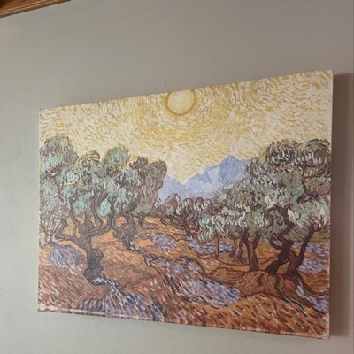 This ready to hang, gallery-wrapped art piece features trees and a bright yellow sun.Vincent van Gogh was a Dutch post-Impressionist painter whose work, notable for its rough beauty, emotional honesty and bold color, had a far-reaching influence on 20th-century art. He sold only one painting during his lifetime, and was little known to the art world at the time of his death, but his fame grew rapidly thereafter. His influence on Expressionism, Fauvism and early abstraction was enormous, and it can be seen in many of his works.Giclee (jee-clay) is an advanced printmaking process for creating high quality fine art reproductions. The attainable excellence that Giclee printmaking affords makes the reproduction virtually indistinguishable from the original piece. The result is wide acceptance of Giclee by galleries, museums, and private collectors. Gallery wrap is a method of stretching an artist's canvas so that the canvas wraps around the sides and is secured a hidden, wooden frame. This method of stretching and preparing a canvas allows for a frameless presentation of the finished painting.Whether it's a contemporary, rustic, modern, or traditional style decor, Trademark Fine Art offers a variety of high-quality, carefully built wall art that will surely complement any style. We provide an abundance of art themes that range from fascinating abstracts to breathtaking landscapes, in an assortment of sizes that will certainly bring excitement to any area of your home. From the bedroom to the living room, or even the office, Trademark Fine Art makes professionally handcrafted, ready to hang wall decor that will be admired for years to come!