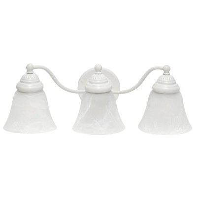 This lovely three light 19.25" vanity fixture has been carefully designed to serve both your lighting and decor needs in a sophisticated, yet traditional manner. Three identical alabaster white shades are held in place on a curved metal bar by matching metal socket holders in the finish of your choice. Perfect for your bathroom, hallway, bedroom, foyer, or above your vanity!