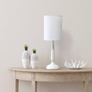 Traditionally crafted of metal, this tall stick lamp measures slightly over 22" in height. Paired with a fabric drum shade, this lamp is sold in a number of base/shade matching color options. Lamps like this are perfectly suited to illuminate your space without drawing too much attention for those who prefer subtle accents in your decor.