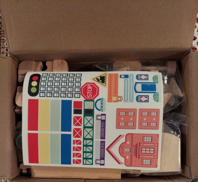 Very cute wooden train set! I’ve seen sets like these before but none made to paint on. There’s stickers for the buildings and road signs. I love this creative edge to create your own town with the paint. These tracks actually fit together with other wooden train sets too!