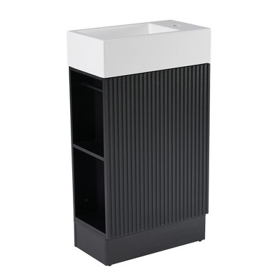This luxury bathroom vanity features a high-quality ceramic sink with a smooth, waterproof finish that resists stains and water spots. The pre-drilled three-hole design accommodates an 8" widespread faucet (sold separately), while the overflow metal ring prevents spills. The solid rubber wood frame and MDF construction ensure durability in humid environments, making it both sturdy and stylish.