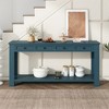- This table is a storage solution masterpiece. It provides ample space with four spacious drawers and a fixed lower shelf. The long tabletop is perfect for displaying decor, making it ideal for organizing your hallway, foyer, or living room efficiently.