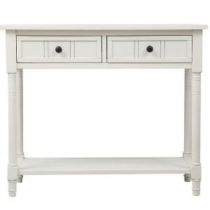 - The table includes two spacious drawers, offering convenient and concealed storage for keys, mail, or small essentials to keep your space organized. Below, a thick bottom shelf provides an ideal display area for décor items, books, or plants, blending functionality with aesthetic appeal in a compact and practical design.