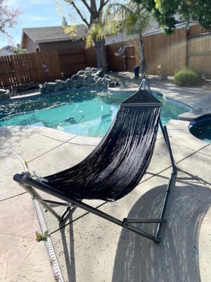 [This review was collected as part of a promotion.] This hammock is so nice and incredibly comfortable. It’s easy to assemble and is very sturdy and well made. It has a heavy metal frame and the material on the hammock is strong. It swings smoothly. Love the carrying case it comes with. It makes it easy to transport to wherever you bring it, like the beach or camping. I love it in my backyard by my pool!