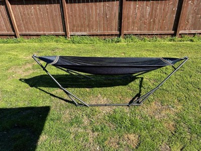 [This review was collected as part of a promotion.] The picture doesn’t do it justice but has been included to show how compact it can be stored. I genuinely liked this hammock! Once I set it up, it was stable but still comfortable to lay in and had a nice swing to it. I love that it folds back up compact so you can store indoors easily in bad weather!