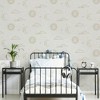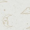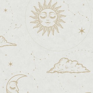 A full roll of this product is 20.5 inches wide and 216 inches long. A full roll can cover up to 30.75 square feet depending on the design match and pattern repeat. A sample of this product is 8 inches by 11 inches. This wallpaper features a celestial-themed design with a subtle, textured background resembling a morning sky. The pattern includes an artistic sun and moon with serene, expressive faces, surrounded by constellations, stars, and swirling clouds in a vintage, hand-drawn style. The gold detailing against the soft backdrop creates a mystical and elegant ambiance.