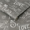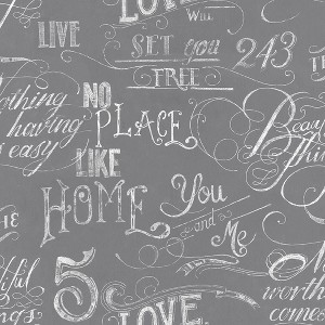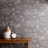 A full roll of this product is 20.5 inches wide and 216 inches long. A full roll can cover up to 30.75 square feet depending on the design match and pattern repeat. A sample of this product is 8 inches by 11 inches. Add a little fun to your home with this cool chalkboard effect wallpaper. This wordy design in different white fonts and sizes creates a playful and modern look for any room on a grey background. This Peel & Stick design is the perfect tool for any DIY project. Offset match with a 20.87 inch pattern repeat