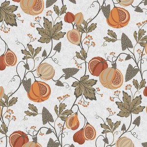 A full roll of this product is 20.5 inches wide and 216 inches long. A full roll can cover up to 30.75 square feet depending on the design match and pattern repeat. A sample of this product is 8 inches by 11 inches. Figgy Tree Orange features a botanical, vintage-inspired pattern with a light, off-white colored background. The design consists of detailed illustrations of figs and leafy vines in earthy tones of orange, brown, and muted green.The overall look is warm, rustic, and elegant, making it ideal for a cozy or nature-themed decor.
