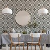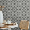 A full roll of this product is 20.5 inches wide and 216 inches long. A full roll can cover up to 30.75 square feet depending on the design match and pattern repeat. A sample of this product is 8 inches by 11 inches. Large Tile Mono showcases a symmetrical, vintage-inspired tile pattern with intricate floral and geometric motifs. Each square is adorned with a central decorative element, surrounded by delicate ornamental details that create a harmonious, repeating design. The balanced combination of curves and structured lines gives it a classic and elegant appearance, suitable for various interior styles.