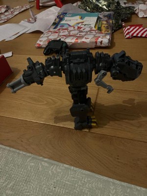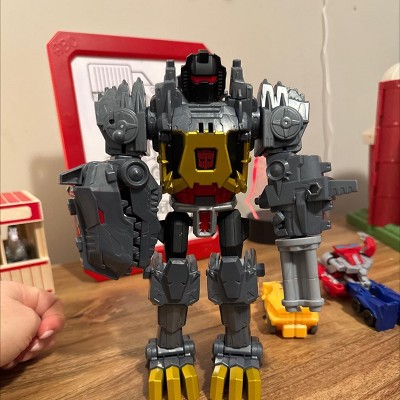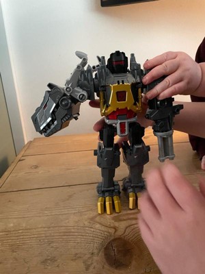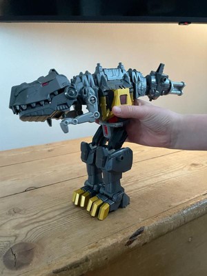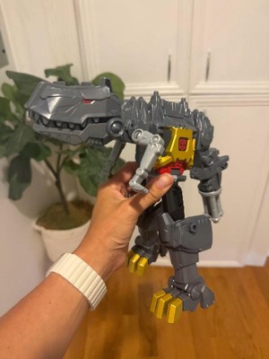 - 9-INCH ROBOT ACTION FIGURE WITH SPINNING BLASTER: In robot mode, the Grimlock action figure is 9 inches (22.5 cm) and features a rotating blaster arm and a chest panel that opens into a mech suit