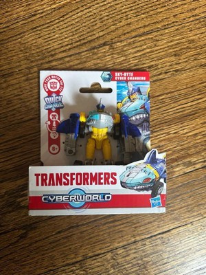 In Transformers CYBERWORLD, kids decide what happens — and it starts with awesome toys like the Sky-Byte Cyber Changers figure. This 4-inch (10 cm) Sky-Byte toy changes from robot to shark vehicle mode in just 4 steps that are simple enough for kids ages 6 and up. Give kids’ storytelling power a boost with additional CYBERWORLD toys (each sold separately, subject to availability), and discover unique characters, alt modes, environments, and more. Fans of Transformers collectibles and newcomers alike will love discovering this take on the Transformers universe, where the only constant is change. TRANSFORMERS and HASBRO and all related trademarks and logos are trademarks of Hasbro, Inc.