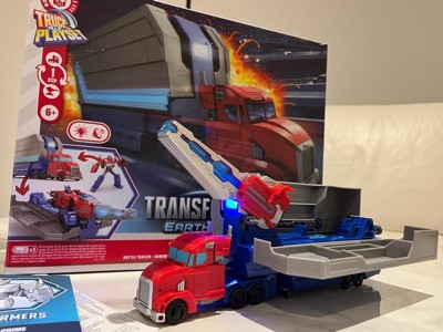 Get ready to roll into battle with the Transformers Optimus Prime Battle Trailer playset! There are so many ways to play with this awesome Transformers toy. Put the 5-inch (12.5 cm) Optimus Prime figure into toy truck mode, then attach the playset in trailer mode and roll out! Then, convert the Optimus Prime action figure into robot mode and flip the blaster on the playset to see it open up into a battle station. The figure can sit in the battle station and man the light-up blaster or the projectile launcher. Kids can load a projectile into the launcher and launch it with the press of a button! With lights and unique sounds in each mode, kids can feel like part of the exciting action of the Transformers: EarthSpark show. Electronic toys like the Optimus Prime Battle Trailer make great gifts for boys and girls 6 and up who love Transformers figures and toy cars. TRANSFORMERS and HASBRO and all related trademarks and logos are trademarks of Hasbro, Inc.