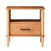Classic, transitional style1 drawer on smooth wood glidesOpen cubby offers display spaceSleek, minimalist handlesMade with solid pine woodVersatile as a nightstand or side table