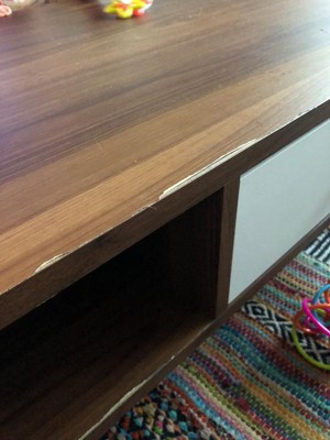 Although it looks great in our livingroom. It was not what we expected. The table is made of cheap particleboard covered with a very thin laminate. It feels very plastic!! After a week of regular use, the laminate started peeling off the edges. After a month the legs started to rip out of their screw holes. Don’t be fooled by its modern look.