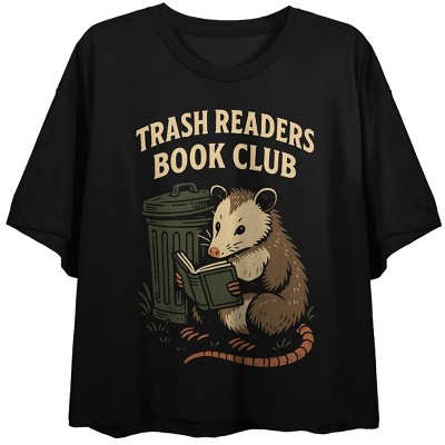 Add quirky flair to your wardrobe with this women's black crew neck short sleeve crop top. Featuring an opossum reading beside a garbage bin under white text that reads, "Trash Readers Book Club," this shirt is perfect for readers with a sense of humor. Crafted from combed ringspun cotton and polyester lightweight jersey, it delivers all-day comfort. Easy to care for, it can be machine washed on cold with like colors and tumble dried on low heat.