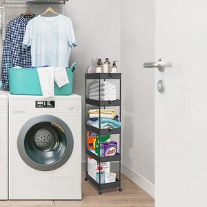 Maximize your storage with this slim 4-tier storage cart, designed to fit tight spaces (just 4.75" wide). Perfect for closets, kitchens, bathrooms, garages, laundry rooms, offices, or even between your washer and dryer.