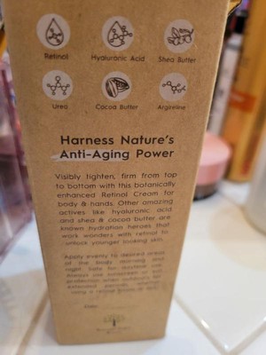 [This review was collected as part of a promotion.] I was incentivized by influenster. I have been using this product for about a month now. It uses all natural ingredients and is not scented. It has retinol and hydraulic acid, and it does not irritate my skin. I have been focusing on my hands and chest to see the results. I have definitely noticed that my skin is firmer in my chest and hands. I love the story it comes with and the little soap seed so that you can grow your own plant.