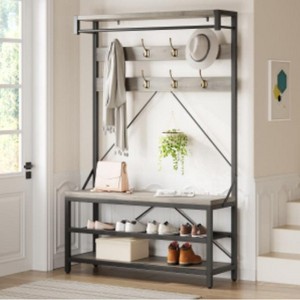 100CM Hall Tree with Shoe Bench, Metal + Particle Board: 100CM large-capacity hall tree with shoe bench, metal and particle board, gray color. Multi-functional design for coats, bags and shoes storage. Suitable for family entryways, keeps space organized.