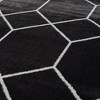A: The rug features a modern geometric trellis design in contrasting black and cream shades.