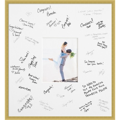 Preserve memories with this conservation-grade signature matboard and handmade frame. Double-thick matboard with a 7 inch width all around the opening holds 50-100 guest signatures and is protected with a UV-resistant sheet of framing acrylic, which shields your signatures and photo from harmful light damage more than traditional glass. Simply open the frame, remove the acrylic, place the mat in the frame for signing in order to assure signatures are fully visible, then replace the acrylic before hanging on the wall. Individually made using traditional custom framing techniques, it has the quality you would expect from your local frame shop and displays your keepsake with premium finishing that can be appreciated up close. BONUS MAT SAMPLE included to test different pens for use prior to signing. Choose pens carefully for fade resistance and the desired look.