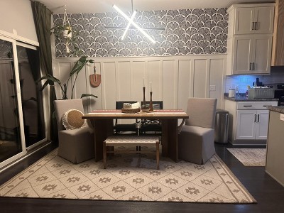 A: The rug features a diamond pattern that enhances the modern look of your space.