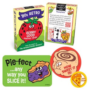 TREND® 80s Retro Collection Playing Cards Plus Deluxe Set | Relive your best-loved decade! This set includes one pack of '80s Retro Playing Cards plus five '80s Retro themed vinyl sticker packs, and nine '80s Retro themed scented sticker packs. Vinyl stickers have 2 or 3 pieces per pack, with sizes from 2-3/8" to 3-3/4". TREND Retro Stinky Stickers are 1-1/4" diameter, and scents include strawberry, root beer, popcorn, chocolate, hot dog, pizza, fruit pie, watermelon, and cinnamon roll.
