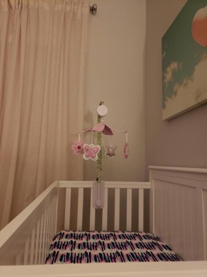 It is a super cute addition to our crib for our little girl! She likes looking up at it when she’s in her crib! Enjoy how pretty the colors and design is. Only thing I wish was different is I wish there was an ON/OFF button instead of wind up. I have to keep winding it up every few minutes so that’s the only downfall of the product.