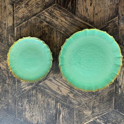 Introducing Trendables' 80 Pieces Plastic Disposable Wedding Plates Set, a sophisticated and convenient solution for your special occasions. This set includes 40 exquisite 7.5-inch plates and 40 stunning 10-inch plates, all in a Mint tint with a touch of opulence provided by the elegant gold rim. Perfectly designed for weddings, holiday gatherings, or any celebratory event, these plates are a seamless blend of style and practicality. Crafted in a round shape with a charming ruffled edge, these plates, also known as petal plates, add a touch of classic elegance to your table settings. The intricate design and thoughtful detailing make them ideal for creating a refined and upscale atmosphere at your event. Designed to meet the demands of modern lifestyles, these plates offer the convenience of disposable dinnerware without compromising on style. The term "fancy plastic plates" truly applies here, as Trendables ensures that each piece is crafted with utmost care to deliver a high-end look. The hammered plastic texture adds an extra layer of sophistication, making these plates a standout choice for those seeking decorative plates for birthday parties or other special occasions. Not only do these plates boast an alluring appearance, but they are also made from 100% BPA-free materials, ensuring the safety of your guests. The set serves 40 guests, making it a practical choice for gatherings of various sizes. Whether you're planning a wedding reception, a festive holiday feast, or an elegant party, Trendables' Plastic Disposable Wedding Plates Set is the perfect solution. Elevate your event with these upscale disposable plates that combine convenience with timeless style, leaving a lasting impression on your guests.