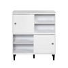 Features: Sliding Door(s), Anti-Tip Anchoring Hardware, Fixed Shelf/Shelves, Divided Storage, Open Shelves