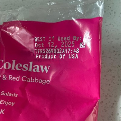 The bag of coleslaw was frozen when I removed it from bag. Had to throw it out. It was hard and icy and our family was very disappointed.