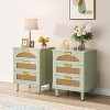 This Rattan Nightstand features a distinct farmhouse design with an stylish mint green finish that blends beautifully into a variety of decor styles. The natural rattan weave on the drawers both keeps the air flowing and adds a touch of rustic elegance and texture. This charming bedside tables not only serves as a nightstand but can also be used as a sofa table, corner table, nightstand, coffee table for small spaces. With its 3-drawer design, it offers the perfect balance of style and function, providing plenty of storage options while enhancing the aesthetics of your living area.