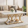 With a white marble veneer top and gold geometric metal legs, adding a touch of modern luxury to the entire coffee table, create a cozy, warm feel in your living space. Spacious tabletop and bottom shelf perfect for keeping your living room supplies organized and your daily essentials close at hand. Our rectangular coffee table has a decent size that is not too big or too small, offering ample storage space while not table up too much space, good for home living room, studio, apartment, etc.With waterproof melamine finish, the coffee tabletop is scratch-resistant and easy to clean. Ideal for working and dining in the living room.
