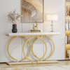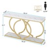 This long sofa table constructs from 1.57" thickened MDF and a timeless walnut finish with unique and natural texture, creating plenty of room for art deco inspiration shine. The smooth surface is durable, waterproof, and easy to clean. The white metal base features an O-shaped symmetric circular design, three loops add an interlocking visual effect that creates a unique artful look. Crafted from durable powder-coated metal frame, this entrance table offers sturdy support for up to 220 lb. Adjustable feet prevent wobbling on uneven floors.