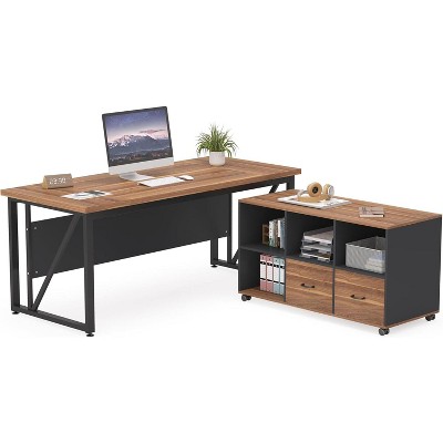 The executive desk and the filing cabinet on wheels form a great team! It saves more time and money for no struggling with how to match them, and it is sturdy and reliable for lasting use. Roll this conventional storage unit with casters anywhere you need. The storage rack with back under the table provides sufficient storage space for your books, power strips, storage boxes; while two drawers file cabinet keeps office supplies hide and neat. This large office desk is made from high-quality particle board and reinforced by a sturdy frame to ensure durability and a large weight capacity, while the scratch-resistant laminate finish protects the surface of the home office desk from daily wear and tear. Besides, adjustable foot pads help keep the desk stable on uneven floors.