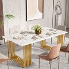 The dining table boasts a modern, color-blocked design, creating a chic and sophisticated look that complements any home decor. With a generous surface spanning 70.87'' long and 31.49'' wide, this dining room table comfortably accommodates 6-8 people for mealtime. The surface is treated to repel water and resist scratches, allowing for easy cleaning with a damp or dry cloth. With a strong load-bearing capacity of 88 lbs, it's also strong enough to hold heavy dishes and decorations. Its versatility makes it a practical and beautiful choice for family dinners or entertaining guests.