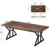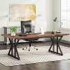 This is a contemporary desk characterized by clean lines and a modern aesthetic. The desk has a dark wood grain finish that lends it an air of sophistication. Supported by a robust white trestle base, it offers a striking contrast and contemporary flair. The desk's expansive surface allows ample room for monitors. Additionally, the desktop provides space for other office essentials.