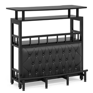 The charming appearance composed of the unique table top with a curved shape, definitely distinct black rail guard, superior upholstered front, and well-placed footrest, is rich but not abrupt, reflecting the connotation of the quality of life best. Adding a string of lights to have your home bar. Quality engineered wood board and high-graded iron frame make it durable and sturdy enough for long-time use. 8 base adjustable feet ensure stability and prevent your smooth floor from unnecessary scratch. A black bar unit with a perfect 44.09'' height makes stemware and bottles easily accessible to you when sitting or standing.