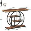 The 41.3" console table with a circle base exudes industrial charm with its rugged and sturdy design. The rustic brown finish on the surfaces of shelves adds a touch of warmth and vintage appeal, and the middle two shelves are ingeniously placed within a large circular metal frame, making it a truly unique and eye-catching centerpiece in the hallway.