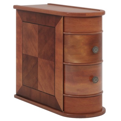 The side table is an Early America-style table in brown, has an attractive vintage appearance, the smooth surface that it's easy to clean; and arc unique design look more comfortable and gentle, reduce the risk of knock, more safety for children.