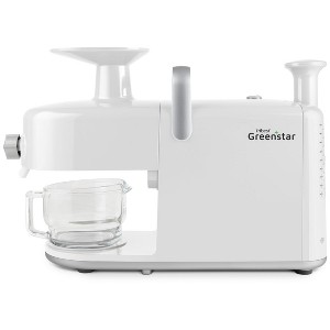 - All Stainless Steel Twin Gears - The Greenstar comes with all stainless steel Twin Gears for added durability, without sacrificing the quality of your juice. The advanced impeller press system rotates at a low RPM and generates minimal heat while juicing. The teeth of the twin gears are designed with special pocket recesses to aid in processing hard vegetables like carrots. Unique cutting points of the twin gears make for quick auto-feed juicing of stringy vegetables like celery and completely masticate your produce, providing a higher juice yield..