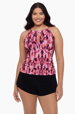 The Chloe tankini combines style and support for a chic, confidence-boosting swim look. Its high neckline with an alluring keyhole detail offers modest coverage with a fashionable twist. Sewn-in cups and a full shelf bra provide excellent support, while the 3-hook adjustable back closure ensures a secure fit. The tankini's adjustable straps allow for a customized fit, and front ruching flatters your figure.