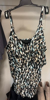 [This review was collected as part of a promotion.] Grabbed this for my mom to try and she really liked it! The quality of the tankini is very nice. There’s a good stretch to the fabric. The leopard print was a little different than what I expected but still nice. The ruffles create a lot of fabric in the front which can be a hit or miss depending on your preference. My mom only washed it once before wearing so I can’t really speak for the durability in the long run.