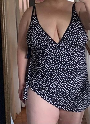 [This review was collected as part of a promotion.] This is such a great “mom swimsuit!” It has great tummy control and actually covers your entire butt, unlike every suit in stores now. The top layer looks great tied and just as cute untied as a little swim dress. The front is pretty low cut, but still offers enough coverage for playing around with kids in the water.