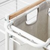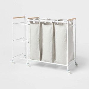 Breeze through laundry day with this Triple Sorter with Shelves from Brightroom™. Supported on a metal frame, this laundry sorter features three compartments with removable bags for sorting through laundry, while the casters at the bottom make it easy to move around. Best of all, it features three open metal shelves at the side to let you store and carry detergent, fabric softener, brushes or other laundry essentials.