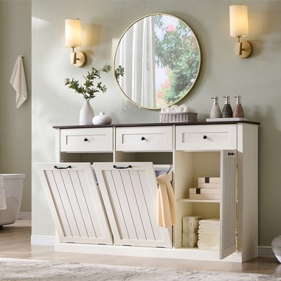 Tilt Out Laundry Hamper Cabinet, Farmhouse Laundry Storage Cabinet with Drawers, Hidden Trash Can Cabinet or Laundry Cabinet for Bathroom, Kitchen