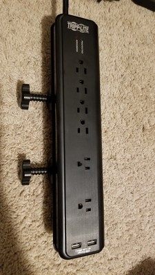 The Tripp Lite® by Eaton® 6-Outlet Surge Protector with Clamps and USB Charging offers economical AC surge suppression for protection of workstations, desktop PCs, telecom systems and other sensitive electronics. Built-in AC surge suppression shields connected equipment from damage and performance problems due to transient surges. USB charging ports offer fast charging for smartphones, tablets, MP3 players and other portable devices. The TLP606DMUSB offers 6 total outlets, a 6 ft. cord, 2 USB charging ports and a diagnostic LED to warn of suppressor damage. AC suppression rated at 2,100 Joules shields equipment from surges and line noise. This matte black surge suppressor has clamps that attach to the side of the desk, workbench or table. 2 knobs easily clamp to desk for better accessibility to plugs—4 standard and 2 adapter-spaced plugs. $40,000 Ultimate Lifetime Insurance._