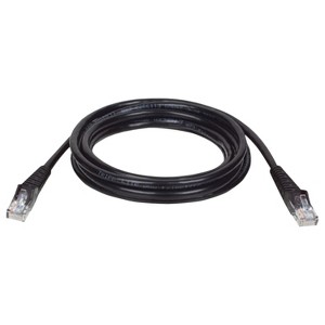 The Tripp Lite® by Eaton® Black CAT-5/5E Cable has 2 snagless RJ45 molded male connectors featuring boots with integral strain relief. The cable is manufactured from PVC 4-pair solid UTP and is rated for 350-MHz/1-Gbps communication. Its snagless design protects the locking tabs on the RJ45 connectors from being damaged or snapped off during installation._
