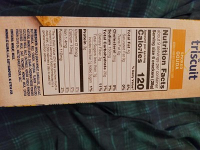Triscuit Smoked Gouda Whole Grain Wheat Crackers are made simply with quality ingredients. Baked to perfection, these snack crackers use 100% whole grain wheat proudly grown in the USA and sunflower oil. The square snack crackers are made with their signature woven texture for a satisfying crunch. Nabisco Triscuit Smoked Gouda crackers are Non-GMO Project Verified, made without artificial colors or flavors and a good source of dietary fiber (see nutritional information for fat content) for delicious wholesome goodness. Enjoy the crunch of these delicious Gouda crackers on their own, or top with your favorite cheese, fruit, or flavorful spreads. Triscuit cracker snacks cover all of your snacking needs, whether you need lunch snacks for kids, snacks for adults or on the go snacks for traveling. Serve them at parties by creating a delicious charcuterie board featuring Triscuit crackers alongside your favorite cheese, meat, fruit, and vegetables for an easy appetizer.