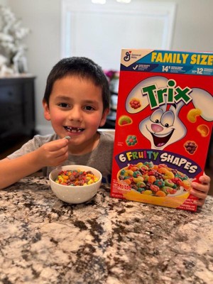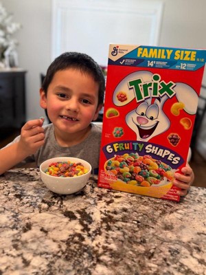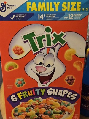 - CONTAINS: One cardboard box of crunchy Trix Fruity Breakfast Cereal, 6 Fruity Shapes, Whole Grain Corn Puffs, Family Size, 16.1 oz; Perfect for instant snacking, or a part of breakfast and meals